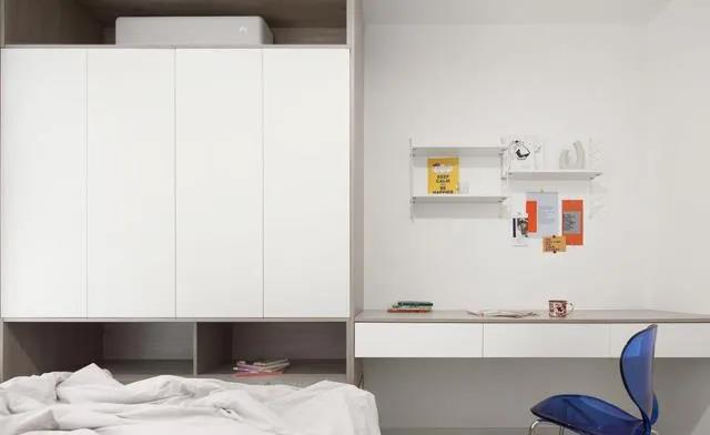 儿童房的布局同样很简单,一组榻榻米结合柜,可以最大化节省空间。衣柜上面留空,可以让收纳更加的自然,不受到尺寸的限制。全包圆书桌上面的装饰隔层设计,则解决了留白问题。