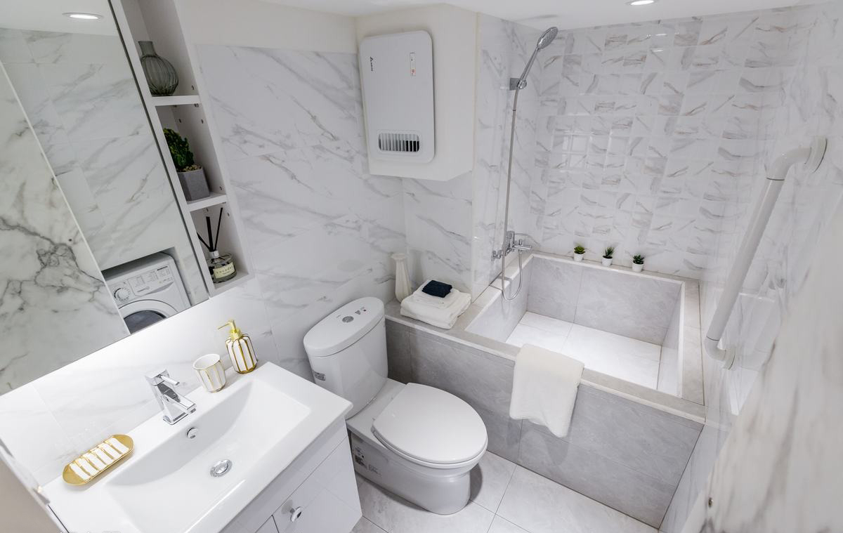 隐藏在暗门后的卫浴,以白色大理石纹为基底,在视觉上表现更为宽敞,屋主在此泡澡时能够全然的放松身心
