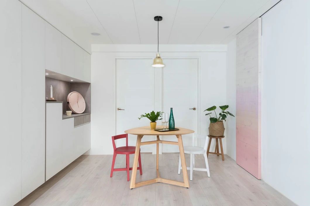 圆形木质小餐桌坐落于两间纯白房门的正中央,卧房出入不受阻,与客厅平行同一轴线,让小空间的视线更加流畅
