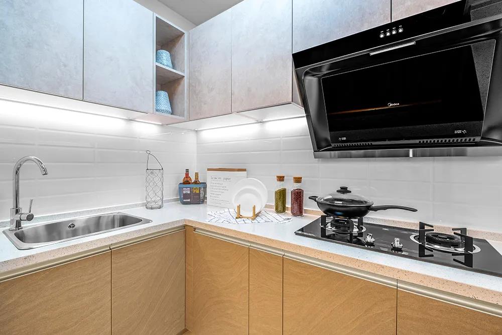 L型整体橱柜,仿石纹橱柜面板,打造一个小清新的自然厨房。
