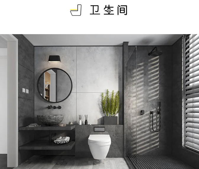 高级灰让卫生间的设计脱颖而出,青灰色墙地砖给人干净又大气的感受,营造出高大上的现代时尚。全包圆在局部的装修上同样贯一匠心。
