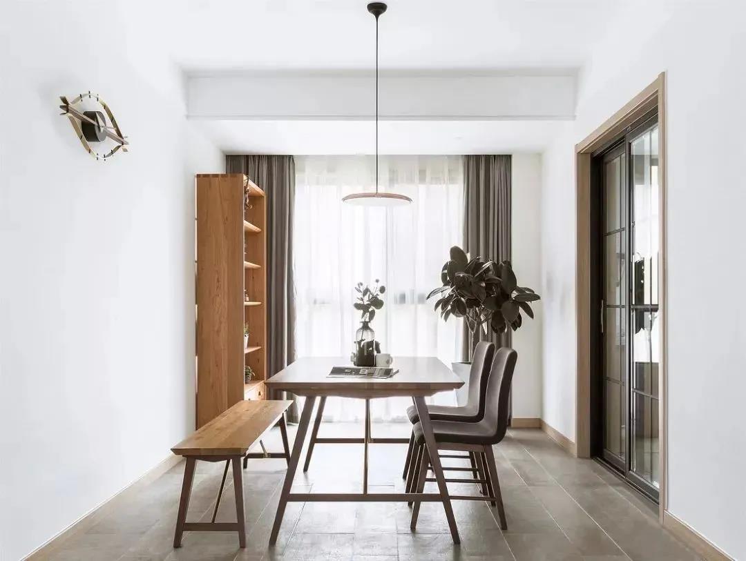 全包圆清新的原木,搭配唯美的绿植、插花,为餐厅创造了活泼与生机。混和着木香、青草香、花香的餐厅,简约又不失温馨。餐桌的一旁还打了一张开放式的餐边柜,用来展示美酒和装饰品,也是不错的选择。