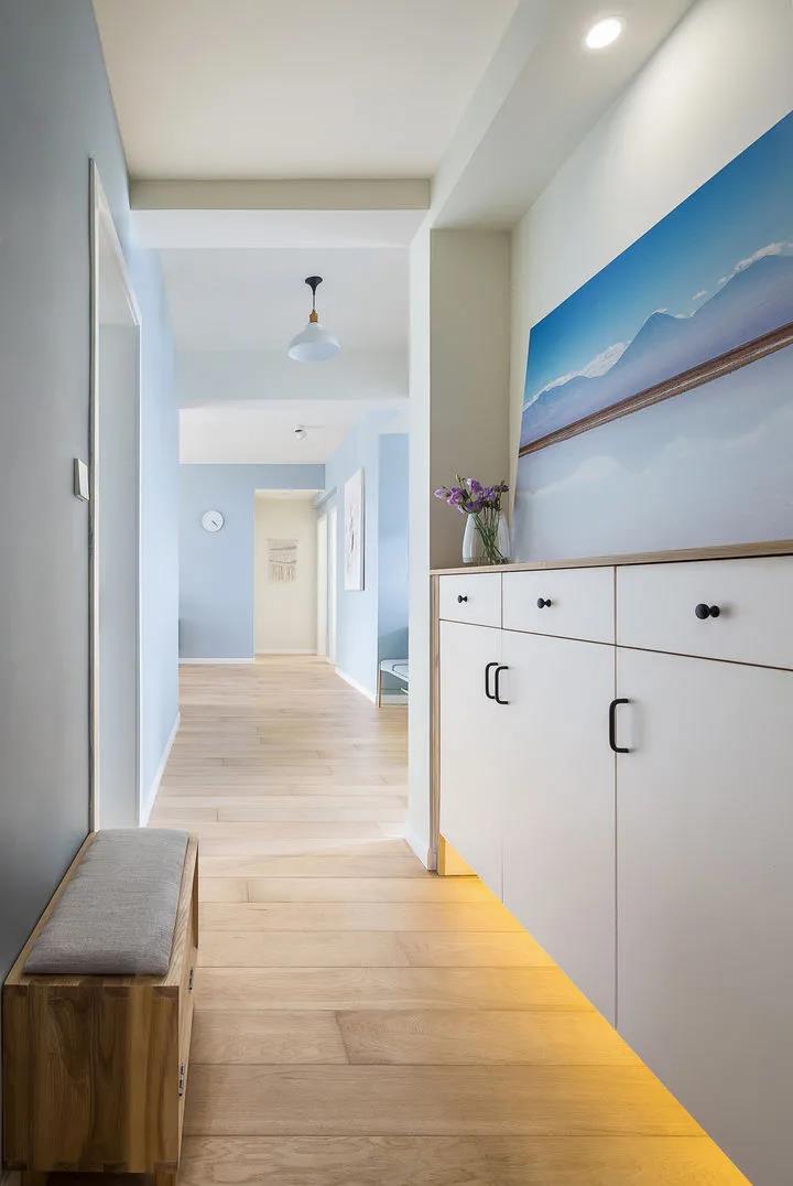 入户的玄关收纳很重要,母亲虽然不是正儿八经的家居达人,却也还是有着过来人的经验。打造了简约的白色鞋柜,一旁是鞋凳,让整个柜面与墙面融合在一起,再通过装饰画的突出北欧的清新自然情调。
